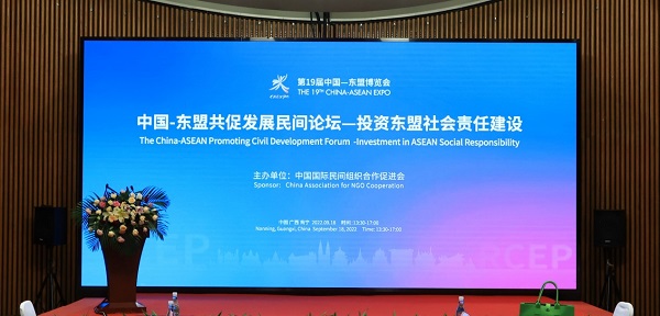 2022年9月18日,第19屆中國-東盟博覽會期間,中國國際民間組織合作促進會(以下簡稱中國民促會)聯(lián)合多家社會組織,在南寧舉辦了“中國-東盟共促發(fā)展民間論壇”,論壇主題為投資東盟社會責任建設。與會政府官員,專家學者,企業(yè)代表,社會組織代表,相聚南寧國際會展中心D103會議室,與線上嘉賓一起,就中資企業(yè)海外社會責任這一議題開展討論。