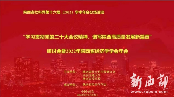 2022年11月12日,由陜西省社會科學界聯(lián)合會、西安交通大學、陜西省委黨校主辦,陜西省經(jīng)濟學學會承辦的陜西省社科界第十六屆(2022)學術(shù)年會分場活動“‘學習貫徹黨的二十大會議精神,譜寫陜西高質(zhì)量發(fā)展新篇章’研討會暨陜西省經(jīng)濟學學會年會”在西安交通大學南洋大酒店順利召開。陜西省社科聯(lián)黨組書記郭建樹、西安交通大學黨委副書記孫早、陜西省委黨校校務(wù)委員張首魁等相關(guān)領(lǐng)導出席會議并致辭,來自省內(nèi)多所高等院校、科研單位的40余位專家學者參加線下會議,30余位陜西省經(jīng)濟學學會會員參加線上會議,同時會議直播吸引500余人次觀看。