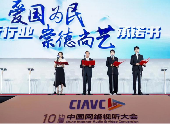發(fā)布儀式上,張凱麗、馬少驊、劉昊然、楊蓉等4位演藝代表宣讀了《新時(shí)代網(wǎng)絡(luò)視聽行業(yè)愛國(guó)為民 崇德尚藝承諾書》,承諾:厚植愛國(guó)為民情懷,明大德、擔(dān)使命;堅(jiān)持以人民為中心,寫人民、抒真情;矢志追求藝術(shù)理想,鑄匠心、出精品;堅(jiān)守德藝雙馨標(biāo)準(zhǔn),守公德、嚴(yán)私德;自覺維護(hù)行業(yè)生態(tài),樹新風(fēng)、展形象。