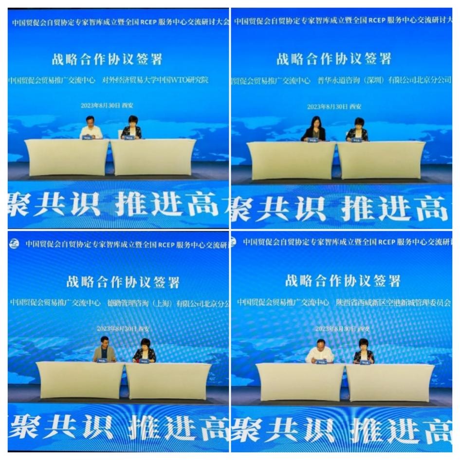 會(huì)上舉行了中國(guó)貿(mào)促會(huì)自貿(mào)協(xié)定專家智庫成立儀式,并為新聘專家頒發(fā)聘書。湖州貿(mào)促會(huì)、柳州貿(mào)促會(huì)、湘潭貿(mào)促會(huì)、舟山貿(mào)促會(huì)新增四家地方FTA服務(wù)中心,中國(guó)貿(mào)促會(huì)副會(huì)長(zhǎng)于健龍為新增的四家機(jī)構(gòu)授牌。中國(guó)貿(mào)促會(huì)貿(mào)易推廣交流中心聯(lián)合遼寧大學(xué)校長(zhǎng)余淼杰發(fā)布《RCEP實(shí)施的經(jīng)濟(jì)效應(yīng)評(píng)估報(bào)告》,全國(guó)RCEP服務(wù)中心及中國(guó)貿(mào)促會(huì)各地FTA服務(wù)中心聯(lián)合發(fā)起《助力RCEP高質(zhì)量生效實(shí)施西安倡議》。此外,中國(guó)貿(mào)促會(huì)貿(mào)易推廣交流中心分別與對(duì)外經(jīng)濟(jì)貿(mào)易大學(xué)中國(guó)WTO研究院、普華永道 PWC、德勤中國(guó)及陜西省西咸新區(qū)空港新城管理委員會(huì)戰(zhàn)略合作協(xié)議。