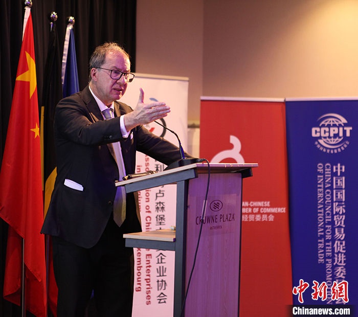 圖為應(yīng)邀出席論壇的比利時中國經(jīng)貿(mào)委員會主席貝爾納·德威特致辭。中新社記者德永健攝