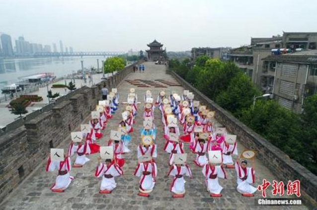 ↑資料圖:湖北省襄陽(yáng)市臨漢門(mén)古城墻上舉辦一場(chǎng)盛大的“開(kāi)筆禮”。周政 攝