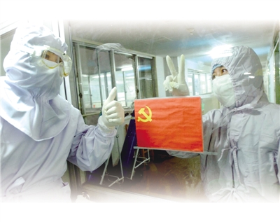 2003年5月11日,在北京中日友好醫(yī)院非典病區(qū),一面鮮紅的黨旗格外醒目。共產(chǎn)黨員安崢醫(yī)生(左)走進污染區(qū),與外面的郭彩虹護士長做手勢相互鼓勵。本報記者 李 舸攝