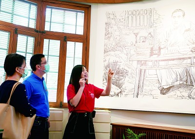 復(fù)旦大學(xué)《共產(chǎn)黨宣言》展示館黨員志愿服務(wù)隊(duì)隊(duì)員陸婷婷(右一)在為觀眾講解。新華社發(fā)