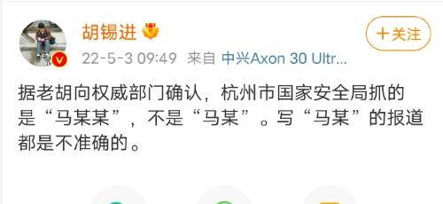 對(duì)于因“馬某”二字引發(fā)的猜測(cè),胡錫進(jìn)專門發(fā)帖說(shuō)經(jīng)他向權(quán)威部門確認(rèn),杭州市國(guó)家安全局抓的是“馬某某”,不是“馬某”。