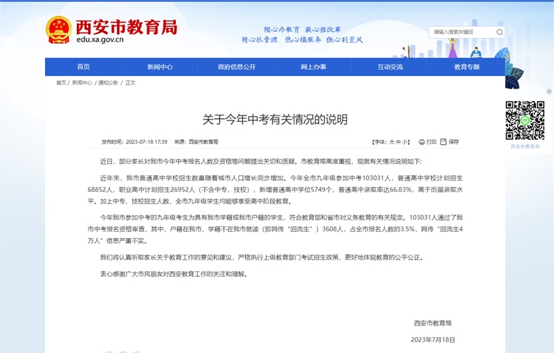 西安市教育局于7月18日發(fā)布的情況說明。官網(wǎng)截圖
