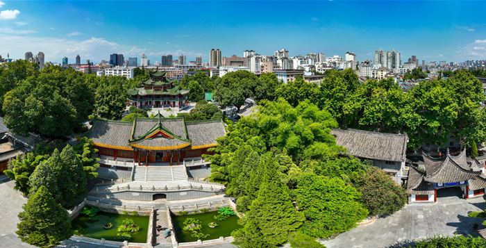“我們面前的這一座高臺(tái),這就是漢王劉邦的宮廷遺址——古漢臺(tái)?!睗h中市博物館講解員介紹,古漢臺(tái)是劉邦被西楚霸王項(xiàng)羽封為漢王時(shí)在漢中的行宮,又名七星臺(tái)。古漢臺(tái)最高處為望江樓,望江樓曾是漢中最高的建筑,采用攢尖頂、廡殿頂、歇山頂?shù)刃沃?,集南北建筑風(fēng)格于一體,是漢中作為國家歷史文化名城的地標(biāo)性建筑。