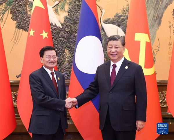 10月20日上午,中共中央總書記、國家主席習近平在北京人民大會堂會見來華出席第三屆“一帶一路”國際合作高峰論壇并進行工作訪問的老撾人民革命黨中央總書記、國家主席通倫。 新華社記者 翟健嵐 攝
