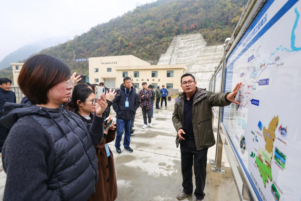 華商網(wǎng)訊(記者/姬文艷 圖片/王警)初冬秦嶺,白雪點(diǎn)綴在斑斕的山巒上,流云奔涌盡顯群山巍峨。位于西安市周至縣樓觀鎮(zhèn)的黃池溝配水No樞紐如一顆嵌于詩(shī)畫美景中的碧玉,講述著“漢水北上”的守護(hù)故事。11月19日,“漢水北上·潤(rùn)澤三秦”引漢濟(jì)渭工程網(wǎng)絡(luò)主題宣傳活動(dòng)采訪團(tuán)走進(jìn)黃池溝配水樞紐,了解漢水之源與關(guān)中大地“手拉手”的故事。