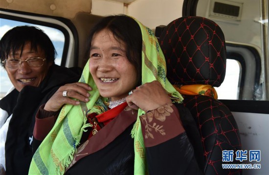 81歲的牧民石秀拉姆(左一)是遷出群眾中最年長的一位,她將在拉薩的新家安度晚年(6月18日攝)。
