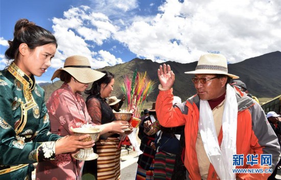 6月18日,嘎沖村群眾(左)向來自遠方的新鄰居敬獻青稞酒。