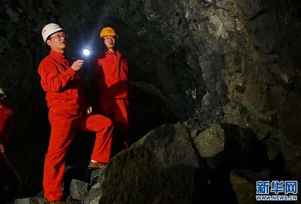 4月7日,中鐵十一局技術人員在檢查隧道圍巖。新華社記者 張汝鋒 攝