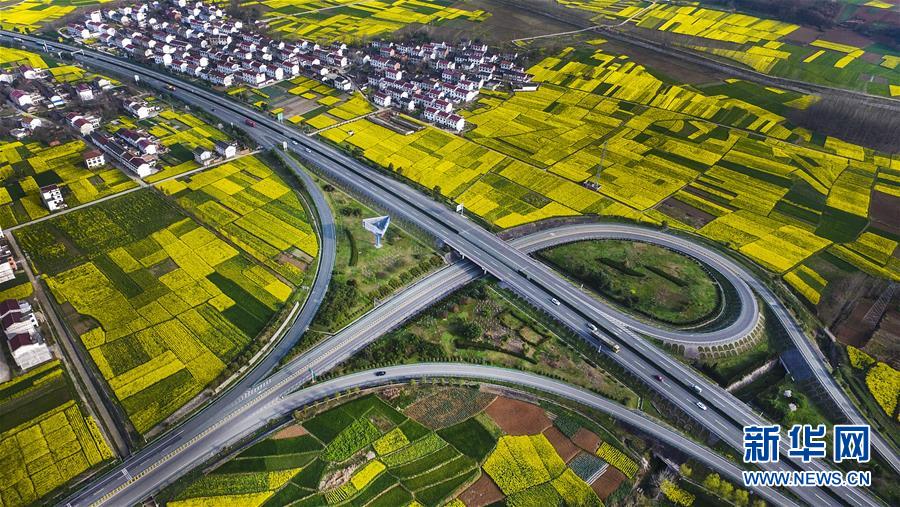 西漢高速公路穿越油菜花盛開的漢中盆地,風(fēng)光秀麗(3月20日攝)。新華社記者 陶明 攝