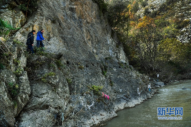 游人在參觀古代穿越秦嶺的山間大道——褒斜道棧道遺址,臨河石崖上的架木鑿孔依然可見(11月23日攝)。新華社記者 陶明 攝