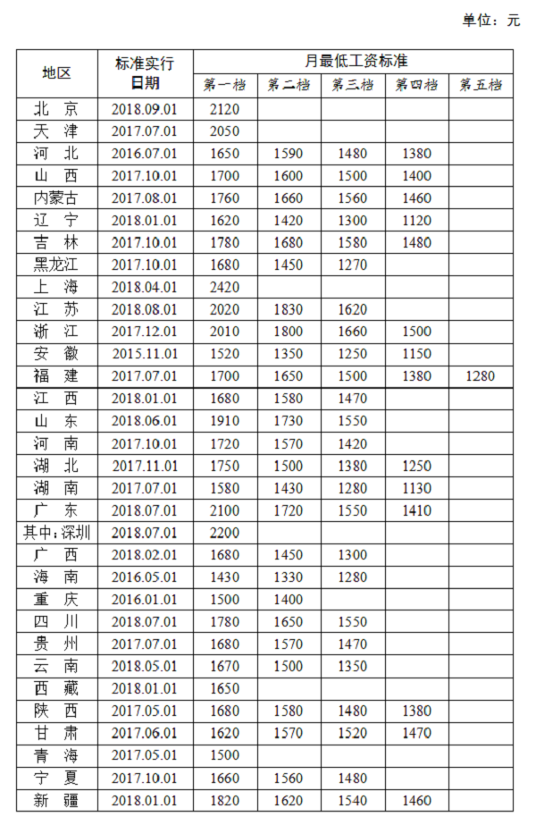 全國各地區(qū)月最低工資標準情況(截至2018年9月),來源人社部官網(wǎng)
