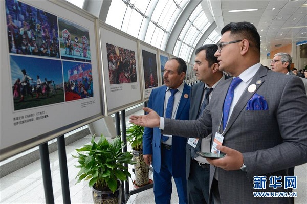 在新疆國際會展中心,外賓在觀看“美麗風光 大美新疆”為主題的圖片展(2月27日攝)。新華社發(fā)(丁磊 攝)
