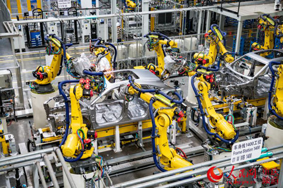 重慶金康SERES(賽力斯)兩江智能工廠,工業(yè)機(jī)器人正在對(duì)汽車車身進(jìn)行焊接作業(yè)。鄒樂攝