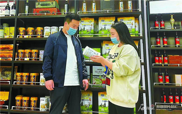 10月8日,在浙江省衢州市新疆農(nóng)產(chǎn)品專營店,工作人員正向顧客介紹新疆的特色農(nóng)副產(chǎn)品。 □夏靈飛攝