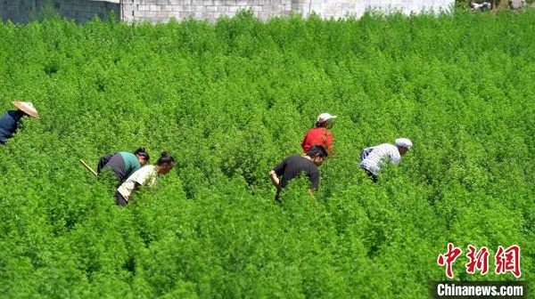 資料圖為酉陽當(dāng)?shù)卮迕裨谔镩g打理青蒿草。酉陽縣委宣傳部供圖