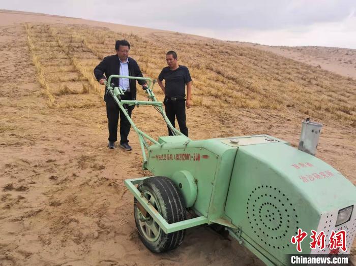圖為甘肅省林草部門工作人員在測試研發(fā)的壓沙機(jī)。(甘肅省林業(yè)和草原局供圖)