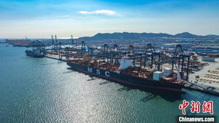 2月18日,地中海航運(yùn)在大連港開通歐洲與地中海兩條航線。圖為“大連—地中?!奔b箱船。(無人機(jī)照片)趙光輝 攝