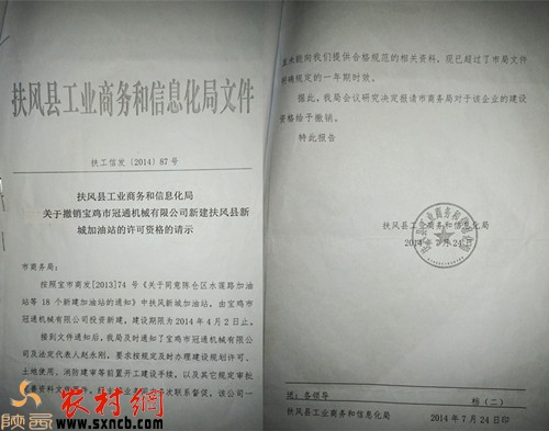 8月17日,記者來到了扶風縣,見到了舉報人曹林生。他告訴記者:“2006年10月27日,寶雞市工業(yè)交通辦公室(現(xiàn)寶雞市商務局)制訂了《2011---2010年寶雞市加油(氣)站行業(yè)發(fā)展規(guī)劃修訂方案》,209省道扶風縣新城區(qū)段規(guī)劃新增一座加油站。碰上這一機遇,我申請成為新城加油站項目投資人,并制作了《抽檢扶風縣新城加油站可行性分析報告》。2007年4月25日,我在扶風縣工商局做了“扶風縣新城加油站”企業(yè)名稱預先核準,《企業(yè)名稱預先核準通知書》載明保留至2014年9月3日。2007年5月15日,我向扶風縣工業(yè)商務信息化局(原扶風縣經貿局)提交了項目申請。同日,工業(yè)商務信息化局向寶雞市商務局(原寶雞市工業(yè)交通辦公室)提交了報告。2011年9月3日,為保險起見,我又在扶風縣工商局做了“扶風縣新城區(qū)加油站”企業(yè)名稱預先核準,《企業(yè)名稱預先核準通知書》載明保留至2014年9月10日。由于我一直未能爭取到土地手續(xù),寶雞市成品零售體系“十二五”規(guī)劃時,我申請保留了“扶風縣新城加油站”。按照國家《成品油市場管理相關規(guī)定》,申報建加油站需要發(fā)改、工商、土地、城建、商務局等部門逐步取得相關手續(xù)方可。2013年1月6日,我再次向扶風縣工業(yè)商務和信息化局提交了申辦“扶風縣新城加油站”申請,得到了相關部門的許可,辦事人員交代我繼續(xù)完善土地手續(xù)。2013年11月29日,我與合伙人蘇國慶終于拿到了“新城加油站”的扶風縣加油站土地使用證。從土地規(guī)劃、收儲、掛牌出讓等一路跟蹤,歷時兩年半耗資兩百余萬,我感覺有幾分欣慰,自己多年的努力終于看到了希望。”