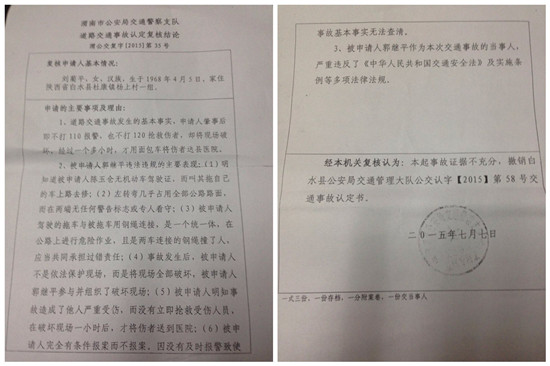 渭南市交通警察支隊(duì)出具被駁回第一份事故認(rèn)定書復(fù)核結(jié)論