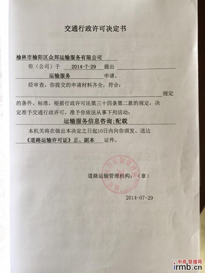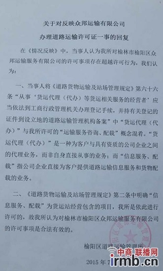 就眾邦公司的普通貨物運(yùn)輸資質(zhì)問題,楊寧讓工作人員向記者提供了該所向眾邦公司出具的《行政許可決定書》。記者看到,榆陽區(qū)運(yùn)管所給眾邦公司的《交通行政許可決定書》中寫到:經(jīng)審查,你提交的申請材料符合哪些規(guī)定一欄竟然是空白的,只有根據(jù)《行政許可法》第三十四條第二款的規(guī)定,決定準(zhǔn)許交通行政許可,準(zhǔn)予你依法從事“運(yùn)輸服務(wù)信息咨詢;配載”。對于“申請材料符合哪些規(guī)定”一欄空白的問題,楊所長解釋說:這是電腦系統(tǒng)就設(shè)定好的,我們沒有辦法修改,《行政許可決定書》是系統(tǒng)自動生成的。我們行政許可的依據(jù)是《陜西省道路貨物運(yùn)輸服務(wù)業(yè)管理實(shí)施細(xì)則》。隨后,榆陽區(qū)運(yùn)管所向記者出具了一份書面回復(fù)。