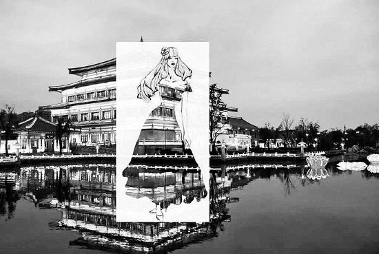 這種名為“把風景穿在身上”的創(chuàng)意,最早源于外國。今年7月,約旦一位時尚插畫師,把設(shè)計手稿的布料進行了裁剪,再用城市的景色填補鏤空,效果居然天衣無縫。