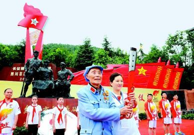 98歲高齡的蒼溪老紅軍歐緒貴老人接過(guò)火炬。劉徽 攝