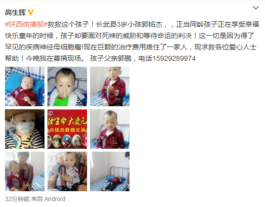 編者按:長(zhǎng)武縣3歲小孩郭銘杰。正當(dāng)同齡孩子正在享受幸??鞓?lè)童年的時(shí)候,孩子卻要面對(duì)死神的威脅和等待命運(yùn)的判決!這一切是因?yàn)榈昧撕币?jiàn)的疾病神經(jīng)母細(xì)胞瘤!現(xiàn)在巨額的治療費(fèi)用難住了一家人,現(xiàn)求救各位愛(ài)心人士幫助!孩子父親郭鵬,電話15929289974