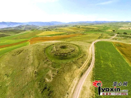 一座直徑70米,高9米,四周布滿巨石的土堆靜臥在東天山山前丘陵地帶的一個山丘上,幾乎占據(jù)了山丘頂部,形似城堡,如同將軍傲視四周。當?shù)氐娜藗円恢闭J為它是古代的軍事防御工事。中國社會科學(xué)院考古研究所新疆考古隊經(jīng)過兩年的原野調(diào)查,根據(jù)現(xiàn)存墓葬型制和采集的遺物初步判斷為秦漢時期的大型墓葬。