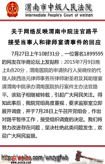 針對此事,記者于7月30日來到了渭南市中級人民法院了解情況,其工作人員告訴記者,看到網(wǎng)上爆料之后,他們找到了當事法官路平,得到他確認之后,在7月28日上午召開黨組會議,決定暫停路平的工作,接受組織調(diào)查,并在渭南中院官方微博上發(fā)出通告。