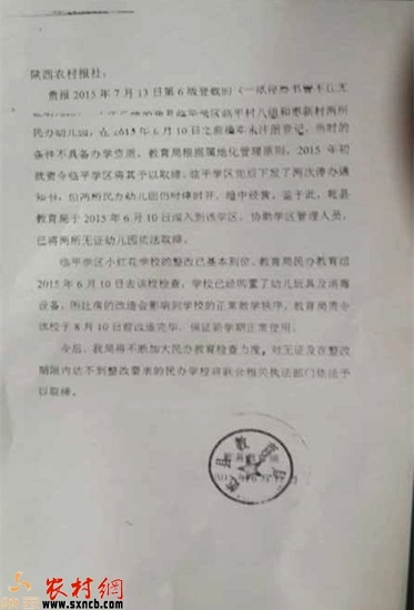 2015年7月13日陜西農(nóng)村報第6版登載《一紙停辦書管不住無證幼兒園》一文,陜西農(nóng)村網(wǎng)以《乾縣兩所幼兒園違規(guī)辦學(xué)縣教育局稱"不好管"》為題進行了轉(zhuǎn)載。乾縣教育局對本報道發(fā)來情況說明,全文如下: