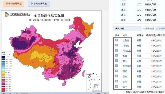 7月15日,據(jù)中國氣象局公共氣象服務中心實況資料統(tǒng)計顯示,截止18時,全國最熱的10個城市全部來自新疆。其中,吐魯番最高氣溫達到44℃,位居全國第一。