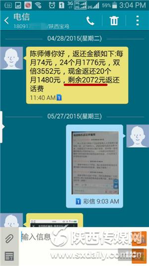 7月7日下午,記者見到了田先生。據(jù)其回憶,2013年8月12日,他在寶雞市高新區(qū)人人樂電信網(wǎng)點購置了一部價值4890元的三星note2手機,購機的同時,手機上會被綁定電信139元套餐,里面包含了通話時間、上網(wǎng)流量等各項優(yōu)惠條件,而用戶自己只需繳納65元話費,電信方贈送74元話費,合約為兩年。如此“誘人”的條件讓田先生心動不已,但沒想到的是,自己認為的“大便宜”卻成難以解決的“大麻煩”。