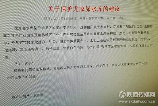 2011年,榆林市政協(xié)委員針對尤家峁水庫污染和安全提出的建議。