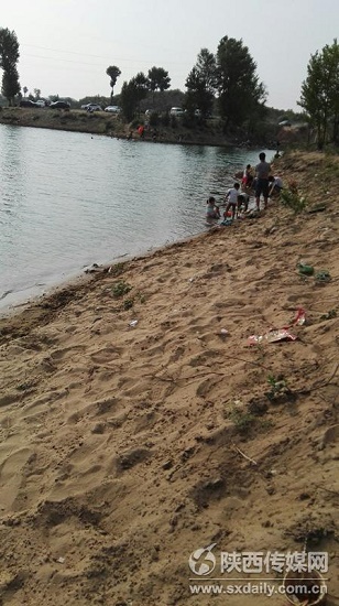 6月27日,尤家峁水庫西北角岸邊游玩嬉戲的人們。