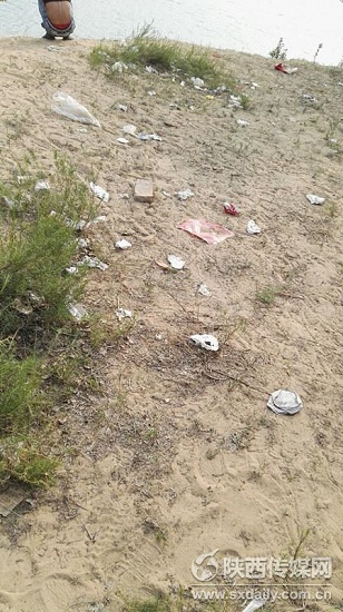 尤家峁水庫邊散落的垃圾。