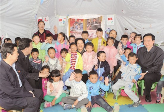 安置點幼兒園干凈整潔,孩子們正在上課??吹綄O春蘭部長來了,齊聲歡呼“孫奶奶好!孫奶奶好!”孫春蘭面帶微笑,和藹地說“小朋友們好!”看到孩子們沒受地震影響,無憂無慮地學(xué)習(xí)生活,孫春蘭十分高興,鼓勵他們好好學(xué)習(xí)、健康成長,長大后把偉大祖國建設(shè)得更加繁榮富強。