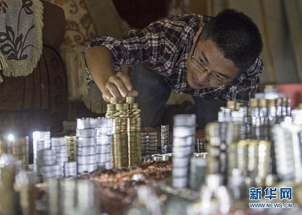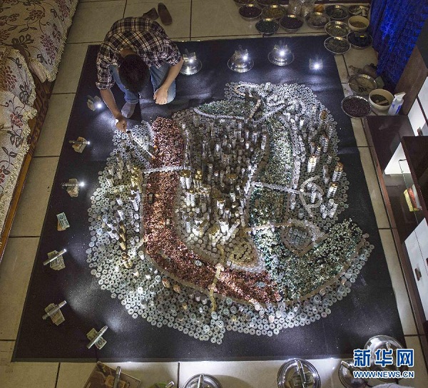 日前,重慶市永川區(qū)“80后”小伙何佩棲耗時(shí)一個(gè)月,用5萬多枚面額不等的硬幣和古錢搭建出重慶市區(qū)沙盤,并用燈光打造出夜景效果。圖為硬幣沙盤。