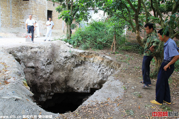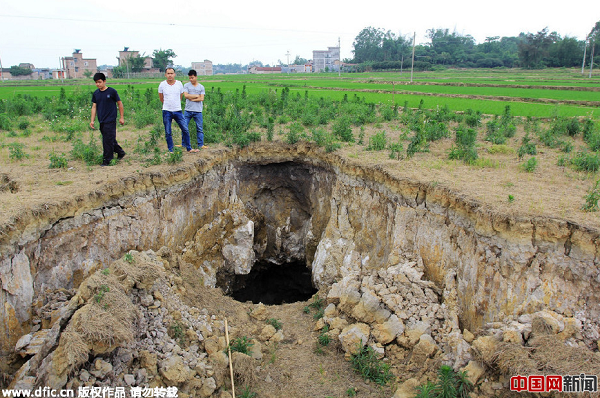 2015年4月28日,進(jìn)入4月以來,廣西玉林市福綿管理區(qū)新橋鎮(zhèn)部分村屯發(fā)生嚴(yán)重地陷。4月27日,記者來到該鎮(zhèn)上垌村,在村里一間民房前,一個巨大的深坑觸目驚心——坑面長約7米、寬5米,而坑底要比坑口大許多。