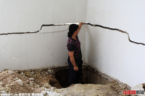 他對記者說:“我們每時每刻都膽戰(zhàn)心驚,家里原先住有10多人,現(xiàn)在大部分搬到別的地方住了。”地陷造成大概9處房屋出現(xiàn)裂縫,有些房屋包括墻上和地板的縫就有近10處,而一些剛建好的小樓也因為出現(xiàn)裂縫而被迫停止裝修。而與上垌村相隔一條公路的射箭垌村也出現(xiàn)幾處地陷。