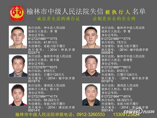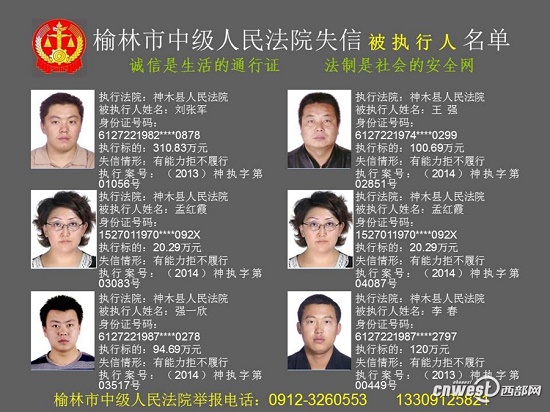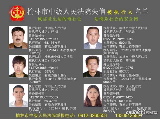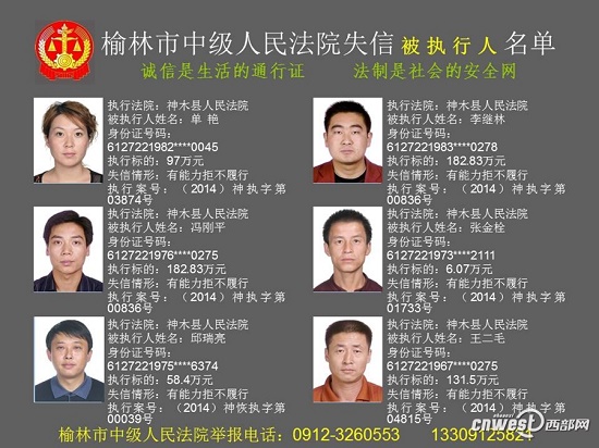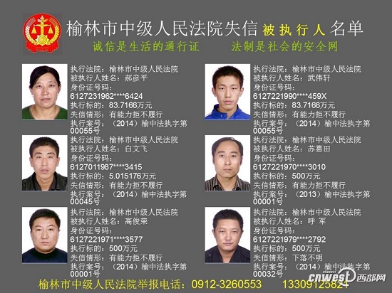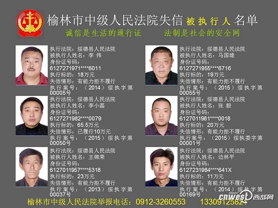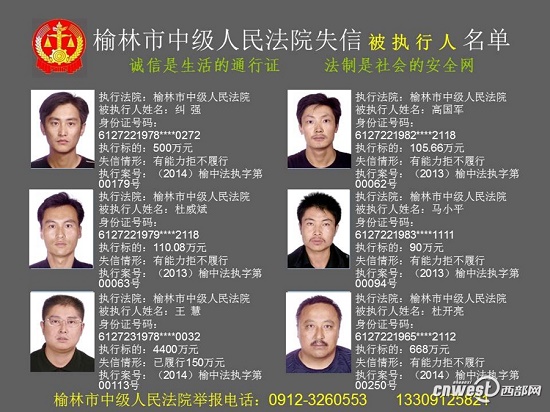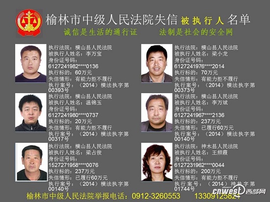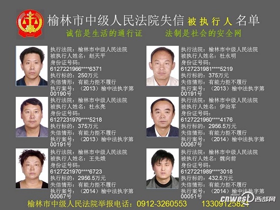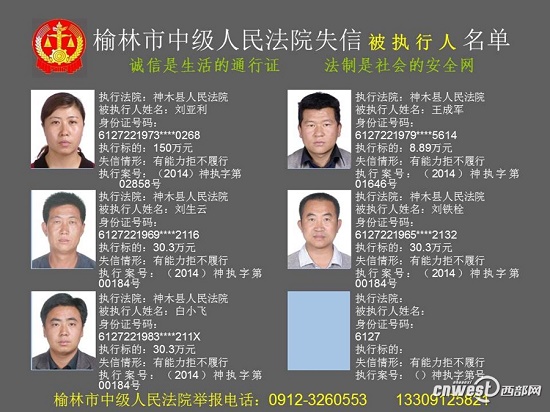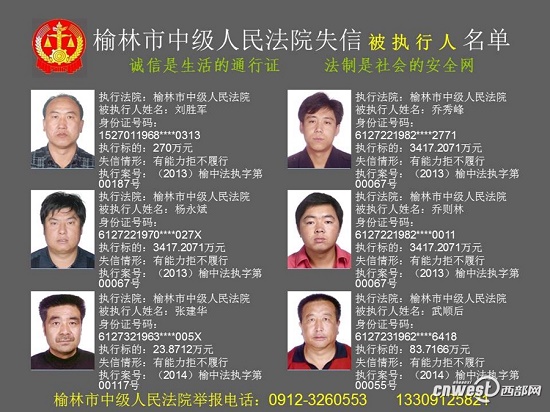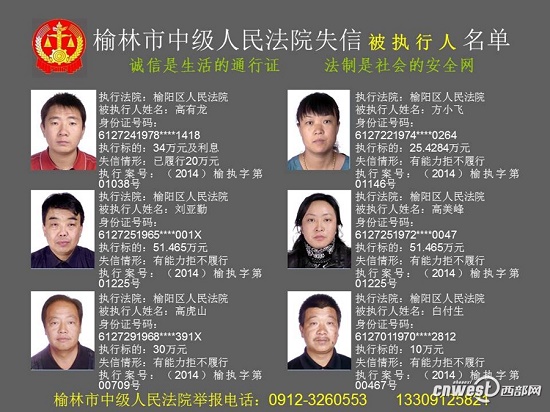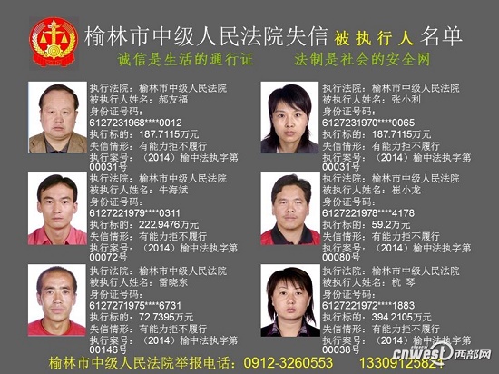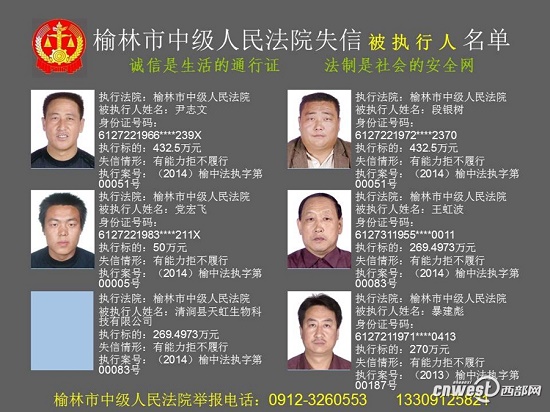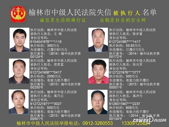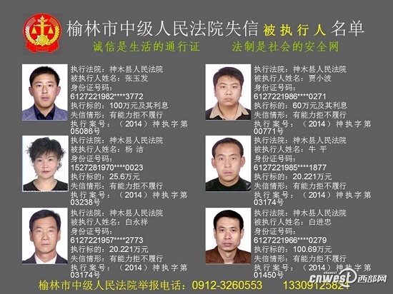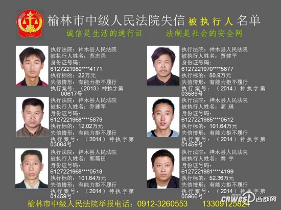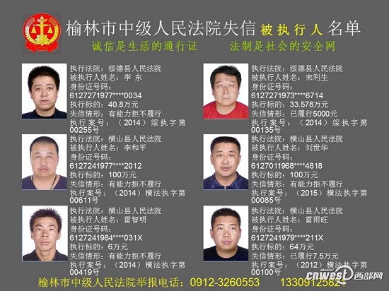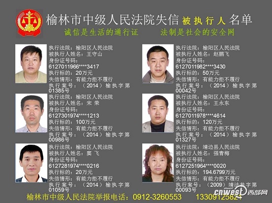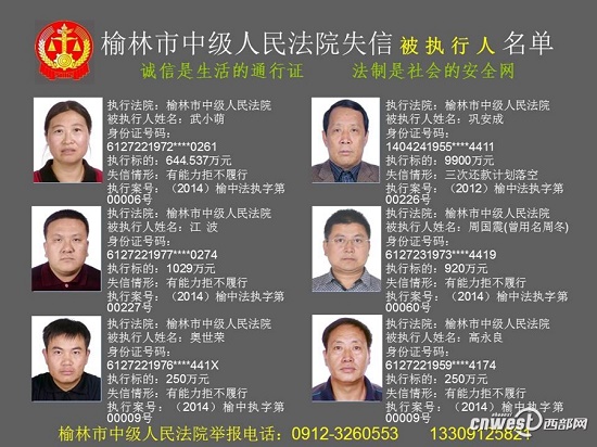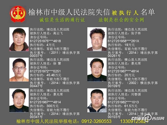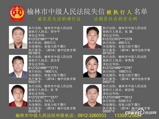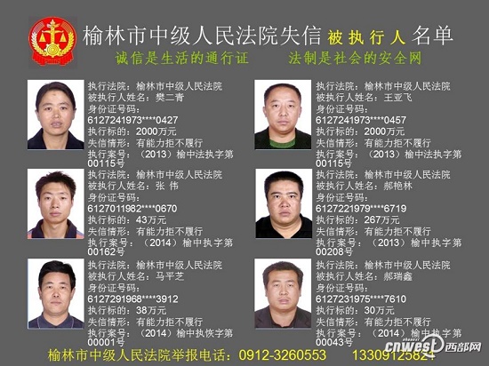 據(jù)了解,榆林為了加大對“老賴”的懲戒力度,維護當事人的合法權益。從2014年10月以來,榆林市中級人民法院先后兩次通過官方微博、微信公眾平臺和平面媒體發(fā)布了失信被執(zhí)行人信息。