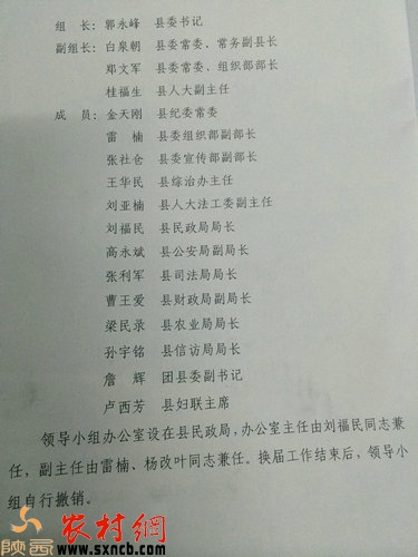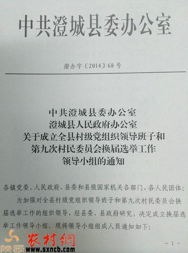 接著,劉主任拿來了澄城縣縣委辦公室澄辦字(2014)68號(hào)文件向記者表明作為民政局所應(yīng)盡的職責(zé),其內(nèi)容如下:關(guān)于成立全縣村級(jí)黨組織領(lǐng)導(dǎo)班子和第九次村民委員會(huì)換屆選舉工作領(lǐng)導(dǎo)小組的通知,其中領(lǐng)導(dǎo)小組成員單位職責(zé)第六條提到,縣民政局負(fù)責(zé)換屆選舉的牽頭綜合協(xié)調(diào)工作,各領(lǐng)導(dǎo)小組辦公室日常工作,指定全縣村民委員會(huì)換屆選舉工作方案,人員培訓(xùn)、掌握選舉動(dòng)態(tài),及時(shí)調(diào)查選舉新情況、新問題、及時(shí)總結(jié)推廣做法經(jīng)驗(yàn),立卷歸檔和工作總結(jié)。