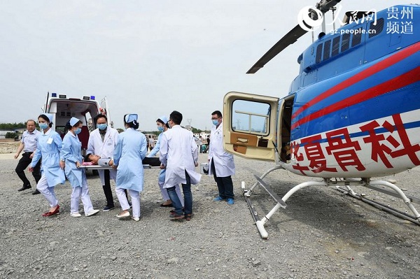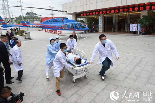 “轟隆隆……”4月20日上午10點(diǎn),救援直升機(jī)從河濱公園起飛,5分鐘不到,就抵達(dá)貴州華夏骨科醫(yī)院。降落,停穩(wěn),機(jī)艙打開后,兩名急救醫(yī)生抬著擔(dān)架小跑上去,把“病人”從直升機(jī)里抬出,迅速送進(jìn)醫(yī)院急救中心。這是醫(yī)院為開展空中救援而舉行的演練,直升機(jī)內(nèi)配備了心肺復(fù)蘇儀、多功能監(jiān)護(hù)儀、便攜式呼吸機(jī)、吸痰器等各類急診搶救設(shè)備和藥品,可以在飛行途中實(shí)施緊急醫(yī)療救援,以著名醫(yī)生領(lǐng)銜的救援團(tuán)隊(duì)將隨時(shí)待命。