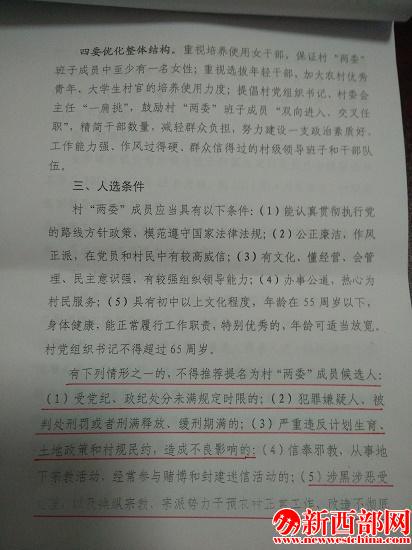 根據(jù)中共長安區(qū)郭杜街道工作委員會第郭發(fā)(2014)68號文件中“五選八不選、人選條件”規(guī)定,內(nèi)容如下:“五選”即:①認(rèn)真貫徹執(zhí)行黨的路線方針政策,模范遵守國家法律法規(guī);②公正廉潔,作風(fēng)正派,黨員群眾威信高;③有文化、懂經(jīng)營、會管理、民主意識強(qiáng),有較強(qiáng)組織領(lǐng)導(dǎo)能力;④辦事公道,熱心服務(wù)村民;⑤初中以上文化程度,年齡在55周歲以下,身體健康,能正常履行工作職責(zé)。特別優(yōu)秀的,年齡可適當(dāng)放寬?!鞍瞬贿x”即:①受黨紀(jì)政紀(jì)處分未滿規(guī)定時(shí)限的;②犯罪嫌疑人、被判處刑罰或刑滿釋放(或緩刑期滿)、被勞教或解除勞教;③嚴(yán)重違反計(jì)劃生育、土地政策和村規(guī)民約造成不良影響的;④信奉邪教或從事地下宗教活動、經(jīng)常參與賭博和封建迷信活動的;⑤涉黑涉惡受處理及操縱宗教宗派勢力干預(yù)農(nóng)村正常工作的;⑥非法串聯(lián)拉票、脅迫蒙蔽群眾或操縱破壞選舉的;⑦政治素質(zhì)和道德品質(zhì)差、拒不履行法定義務(wù)、沒有群眾威信的;⑧喪失行為能力或體弱多病不能正常工作的。