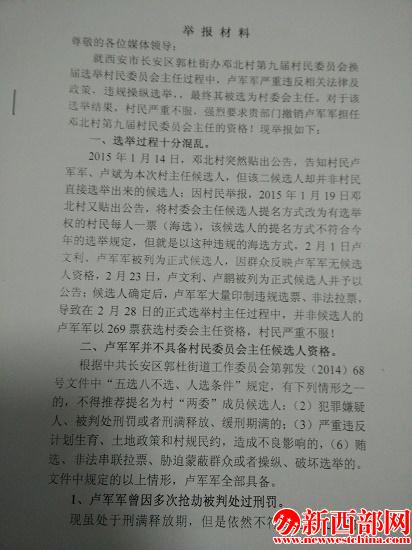 網(wǎng)帖反映:西安市長安區(qū)郭杜街辦鄧北村第九屆村民委員會換屆選舉村民委員會主任過程中,當(dāng)選人盧軍軍嚴(yán)重違反相關(guān)法律及政策,違規(guī)操作選舉,最終其被選為村委會主任。對于該選舉結(jié)果,村民嚴(yán)重不服,強(qiáng)烈要求撤銷盧軍軍擔(dān)任鄧北村第九屆村民委員會主任的資格。