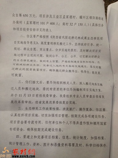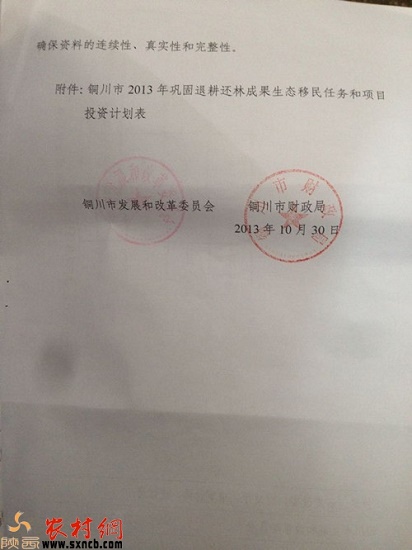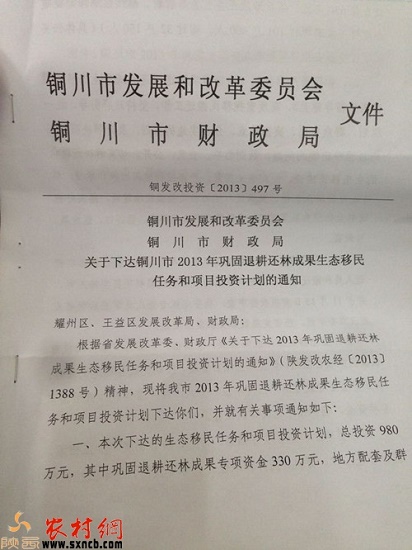 隨后,記者在王益區(qū)發(fā)改局提供了銅川市發(fā)展和改革委員會同銅川市財政局聯(lián)合下發(fā)的文件《關(guān)于下達銅川市2013年鞏固退耕還林成果生態(tài)移民任務(wù)和項目投資計劃的通知》中看到,文件中明確要求:要按期完成各項建設(shè)任務(wù),項目資金要??顚S?,任何單位和個人不得弄虛作假和挪用國家專項資金,確保按期完成建設(shè)任務(wù)。