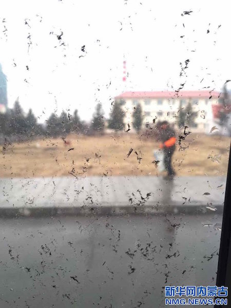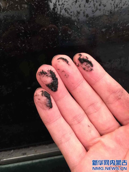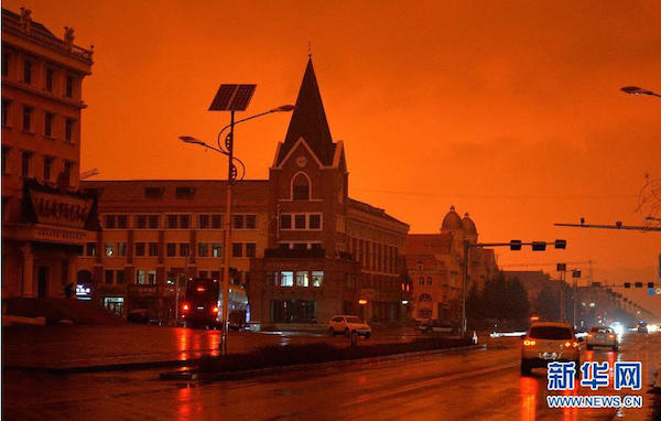 4月15日下午2點左右,內(nèi)蒙古阿爾山市驚現(xiàn)紅色天空,并伴有小雨,雨水中含黑色物質(zhì)。2點40分,紅色天空開始消散,2點50分,天空恢復(fù)正常。(王靖 攝影報道)